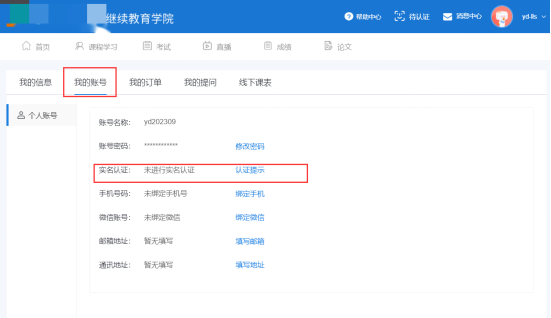 点击【我的账号】,查看实名认证,点击“认证提示”,根据提示进行人脸识别实名认证。