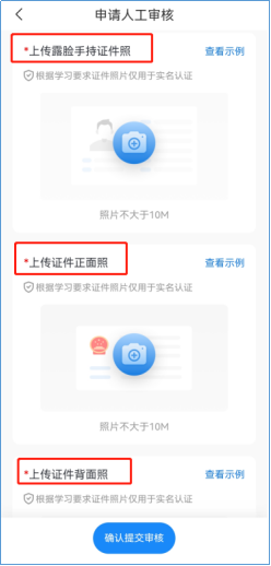 注意:若人脸识别已连续3次认证不通过,可以申请重新认证,或申请人工审核,须上传露脸手持证件照、证件正面照、证件背面照。待人工审核通过后才可完成实名认证。
