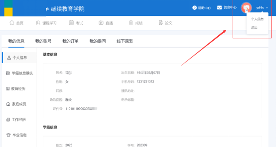 点击【个人信息】,可查看基本信息和学籍信息。