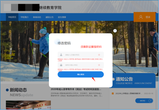 首次登录需要对密码进行重置,按照规则重置密码后,则自动跳转至登录成功界面。