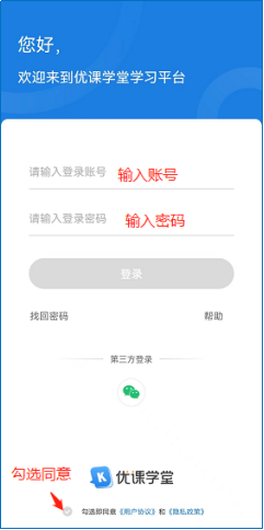 进入APP登录页面,输入学校提供的账号和密码进行登录,确认勾选【用户协议】和【隐私协议】,首次登录需要对密码进行重置,重置密码后可完成登录。
